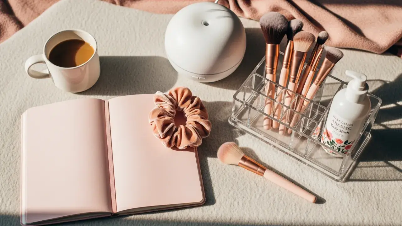 Scrunchies, organizador de bolsa, pincéis de maquiagem, porta‑maquiagem de acrílico e body splash. São úteis, delicados e têm ótimo custo‑benefício.